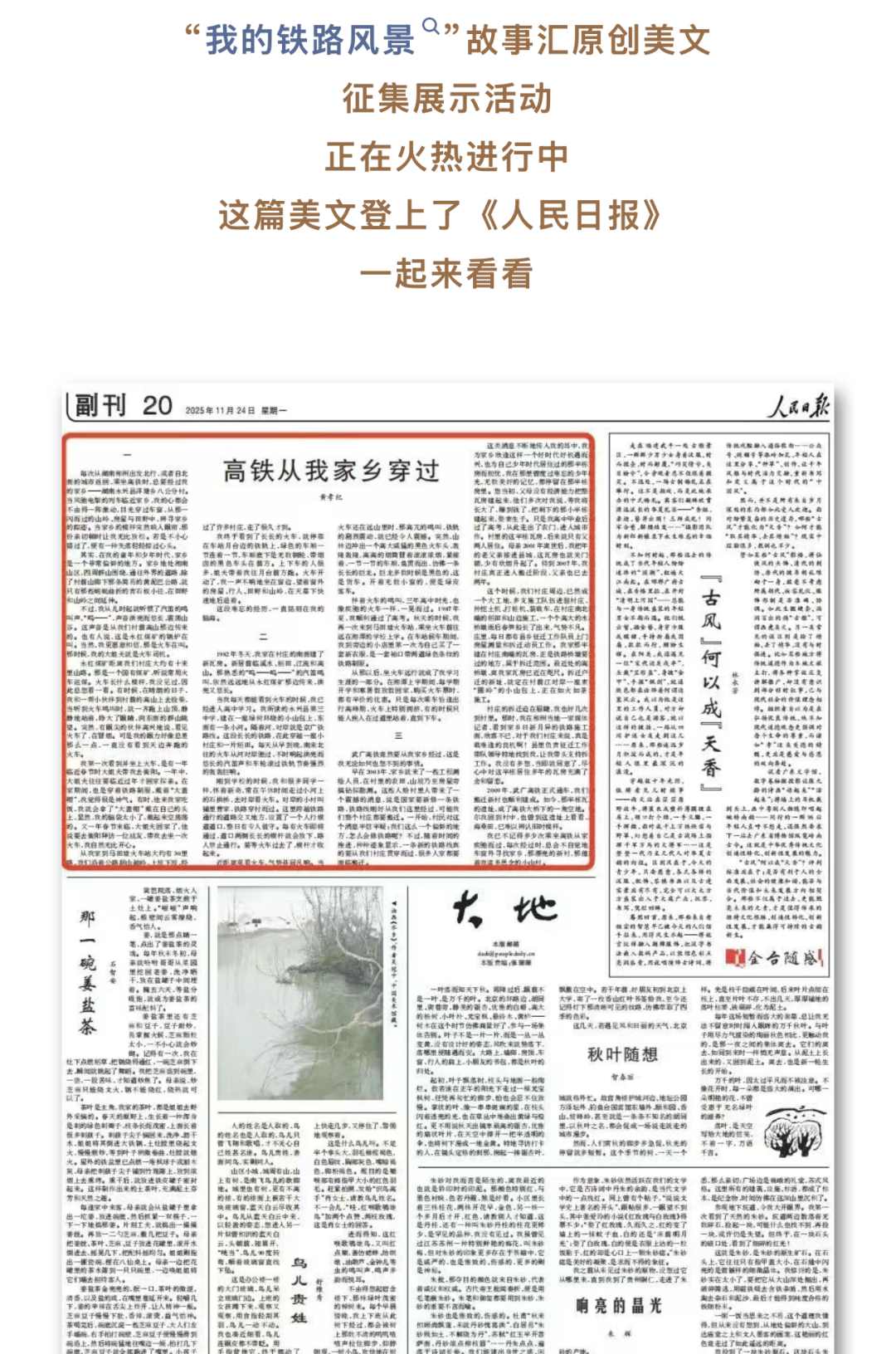 2025年,中宣部文明创建局、中央网信办网络传播局、广电总局宣传司、中国作协创联部、国铁集团党组宣传部联合开展三季“我的铁路风景”主题宣传活动,人民日报、央视新闻、新华网客户端、学习强国、中国文明网,抖音、微博、小红书和“中国铁路”全媒体等20余个平台倾力承办,共征集到原创作品76万余个,展示传播7万余个,话题传播量超90亿人次。
