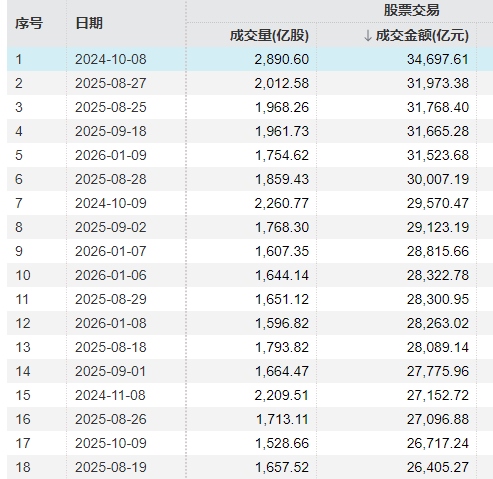 据Wind统计,A股成交额突破3万亿元此前总共发生了6次,分别是2024年10月8日,2025年8月25日、8月27日、8月28日和9月18日,2026年1月9日。