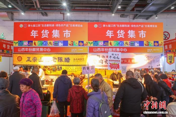 中新社南昌1月16日电 (记者 吴鹏泉)湖南新化红茶、山西老陈醋、江西赣南脐橙……第七届江西“生态鄱阳湖·绿色农产品”交易博览会(简称“江西农博会”)16日在南昌开幕,逾800家展商携6000余款产品参展,搅热江西年货市场。