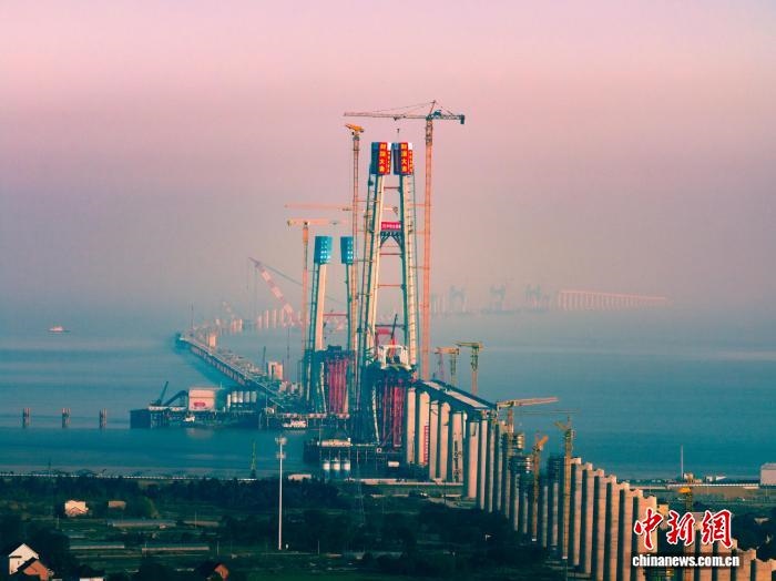 杭州湾跨海铁路大桥北航道桥8号主塔封顶。嘉兴海事局供图