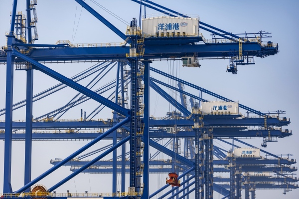 在海南岛西北端的洋浦港,高大的岸桥整齐排列,正繁忙吊运运往来货轮上的集装箱,展现出一幅“陆海联动”的生动图景。