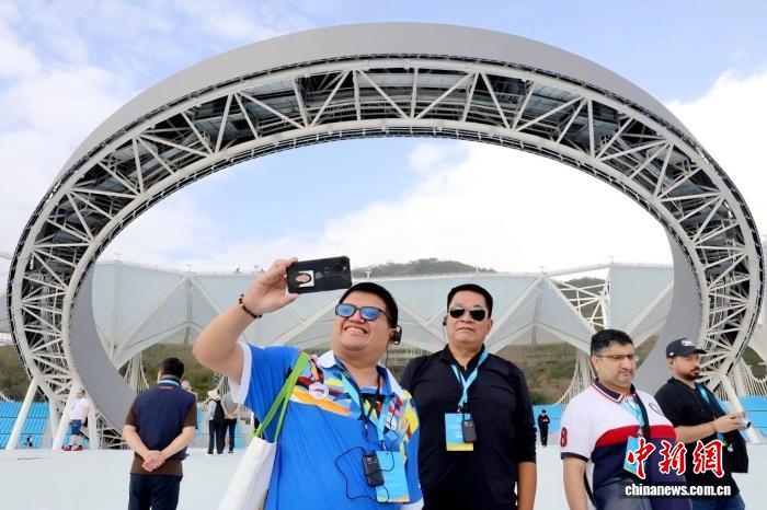 1月19日,第六届亚洲沙滩运动会世界媒体大会暨世界转播商大会在海南三亚举行。图为国际记者参访三亚天涯海角游览区亚沙公园。(第六届亚洲沙滩运动会执委会 供图)