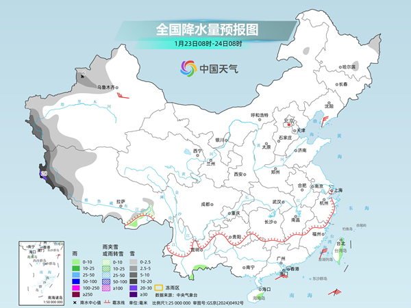 中央气象台预计,今天,新疆南疆西部山区、西藏西部等地部分地区有小到中雪,其中,新疆南疆西部山区部分地区有大到暴雪。湖南南部、广西西北部等地局地有冻雨。云南东南部、广西中东部、福建中部、台湾岛中东部等地部分地区有小雨,其中,台湾岛东部局地有中雨。