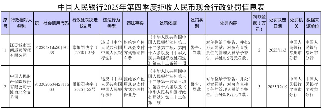 据中国人民银行微信公众号消息,2025年第四季度,中国人民银行对2家核实为拒收人民币现金的单位及相关责任人依法作出经济处罚。广大经营主体应强化法治观念,尊重公众支付选择权,共同打造和谐现金流通环境。