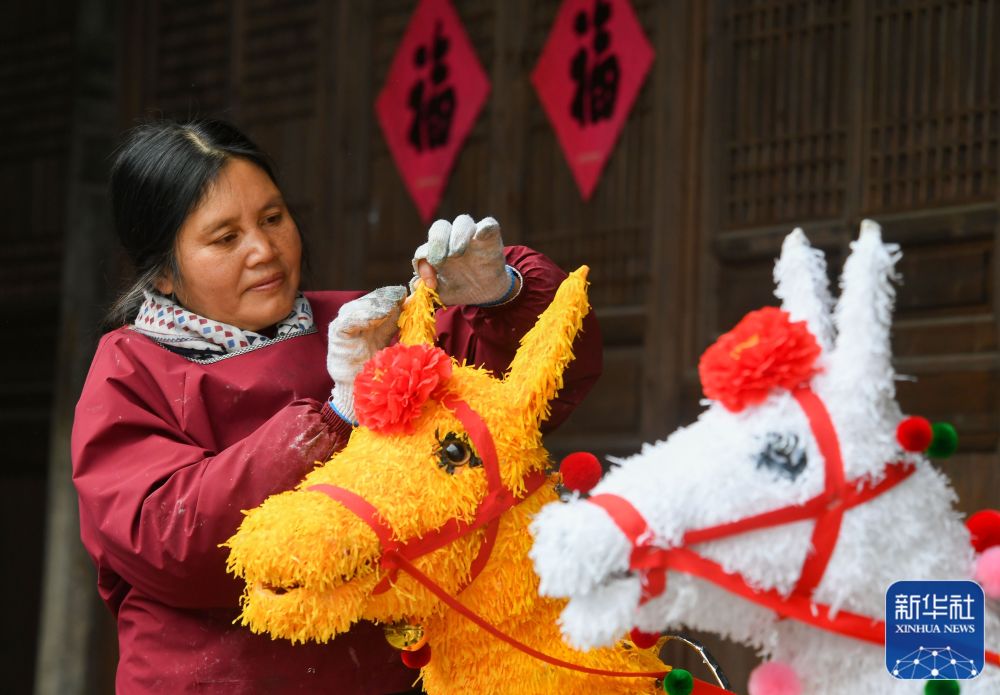 ↑ 1月21日,浙江省金华市浦江县檀溪镇潘周家村一古厅堂内,村民在制作擂马灯。新华社发(时宽兵摄)