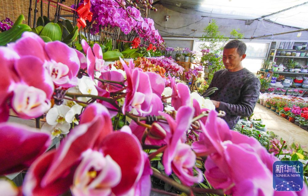 ↑1月22日,河北省遵化市遵化镇张家坎村农民在暖棚管护花卉,准备供应节日市场。新华社发(刘满仓摄)