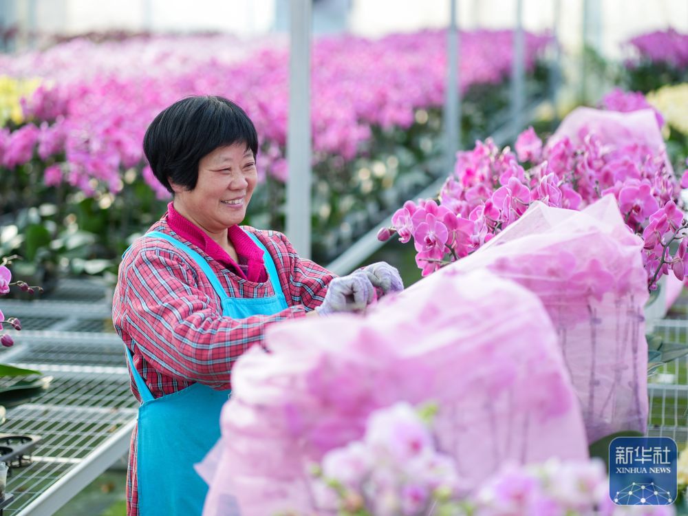 ↑1月23日,花卉工人在江苏省泰州市姜堰区顾高镇现代园艺产业园基地为花做造型,准备供应节日市场。新华社发(周社根摄)