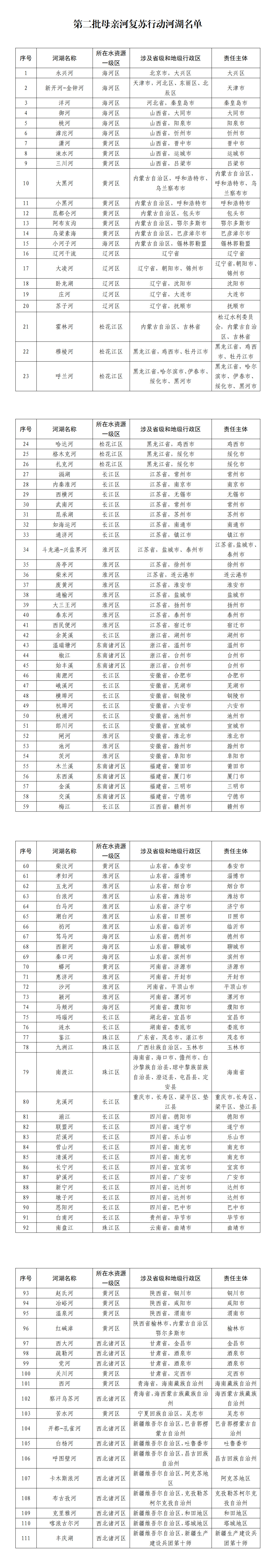 2022年以来,水利部围绕解决河道断流、湖泊萎缩干涸问题,在全国率先选取了88条(个)河(湖)开展母亲河复苏行动。为进一步扩大母亲河复苏行动范围,水利部聚焦河道断流、湖泊萎缩、水动力不足等问题,全面分析河湖水资源、水生态状况,将复苏需求迫切、具有复苏可行性的111条(个)河(湖)纳入第二批母亲河复苏行动,涉及29个省份和新疆生产建设兵团。
