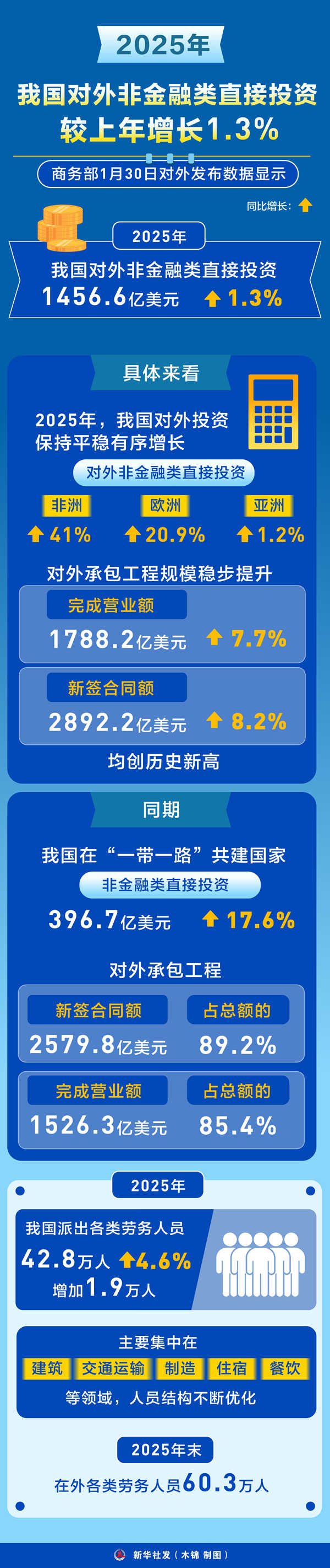 新华社北京1月30日电(记者 谢希瑶)商务部30日对外发布数据显示,2025年,我国对外非金融类直接投资1456.6亿美元,较上年增长1.3%。