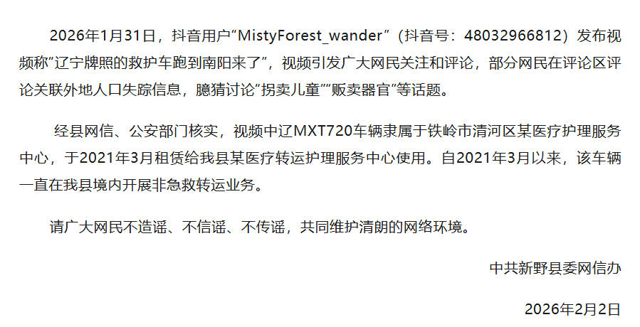 中国网2月2日讯 据“新野发布”微信公众号消息,2月2日上午,河南省南阳市新野县委网信办发布情况说明称,2026年1月31日,抖音用户“MistyForest_wander”(抖音号:48032966812)发布视频称“辽宁牌照的救护车跑到南阳来了”,视频引发广大网民关注和评论,部分网民在评论区评论关联外地人口失踪信息,臆猜讨论“拐卖儿童”“贩卖器官”等话题。