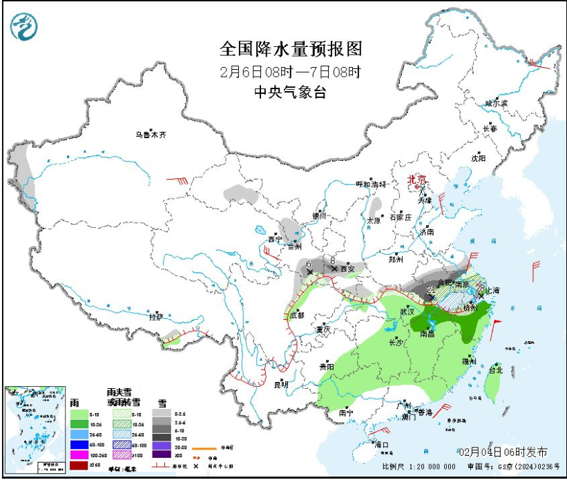 2月6日08时至7日08时,新疆南部、甘肃河西和中南部、陕西中南部、湖北北部、河南南部、安徽中南部、江苏中南部、上海、浙江北部等地部分地区有小到中雪或雨夹雪,其中,陕西中部、河南南部、安徽中南部、江苏中南部、浙江北部等地部分地区有大到暴雪或雨夹雪,安徽西南部局地大暴雪(20~21毫米)。江汉东部、江南大部、重庆东北部、华南北部、广西西南部、广东东南部、台湾岛等地部分地区有小到中雨,其中,浙江北部等地部分地区有大雨(25~28毫米)。黑龙江东北部、青海东部、新疆南疆盆地等地部分地区有4~6级风,阵风6~7级,东海大部、台湾海峡将有6~8级风、阵风9级,黄海中部和南部、台湾以东洋面、南海东北部将有5~7级风、阵风8级。