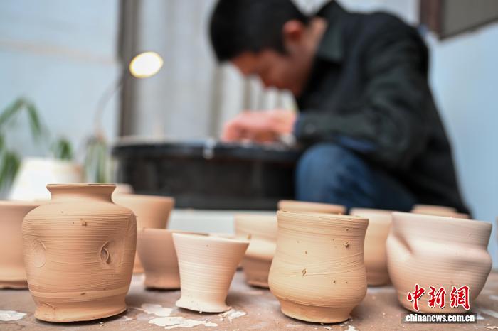 台湾青年张昀澂正在亲手制作陶瓷茶杯,这是他为茶友准备的新年礼物。记者 刘忠俊 摄