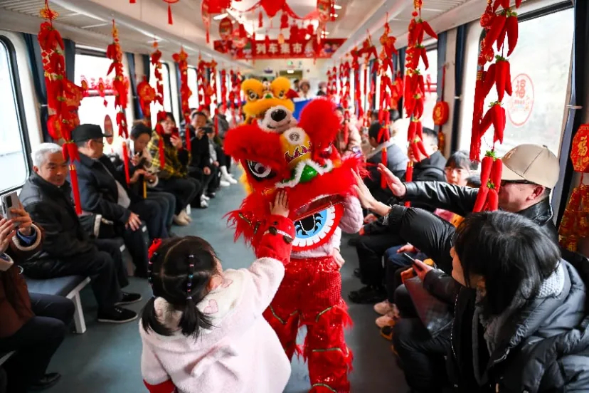 2024年2月23日,5630次列车上,旅客与舞狮互动。当日,在元宵节到来之际,形式多样的闹元宵活动在贵州遵义开往重庆西的5630次公益性“慢火车”上举行,吸引不少旅客参与其中,感受浓浓节日气氛。 中新社记者 何蓬磊 摄