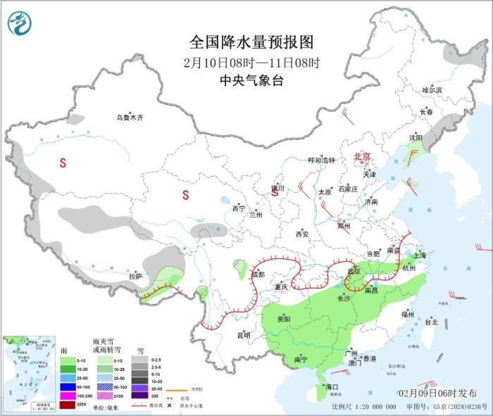 图2 全国降水量预报图(2月9日08时-10日08时)图片来源:中央气象台网站