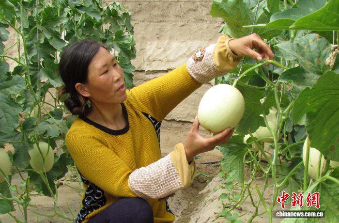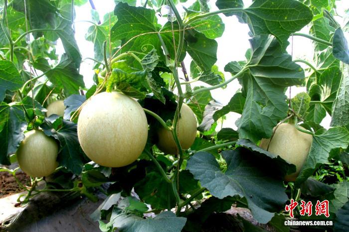 图为原本伏地生长的台湾“玉菇”甜瓜,落户民勤变成了吊瓜。马爱彬 摄