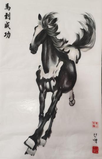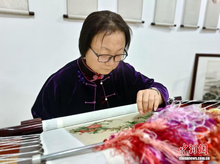 中新网泰安2月10日电 (梁犇 孙倩)春节将至,山东泰安新泰市“鲁绣工坊”产业园区内,山东省省级非物质文化遗产代表性项目中式服装制作技艺(玉氏鸿叶旗袍制作技艺)代表性传承人牛玉叶,正俯身于一幅即将收针的《马到成功》刺绣作品前,为迎接农历马年做最后赶工。纤如发丝的黑色绣线在洁白鲁锦上往复穿引,渐渐跃出一匹昂首奔腾的骏马。