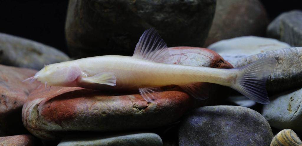 这是“纳雍盲高原鳅”的活体图,其身体呈现透明淡粉色,鳞片消失,眼睛退化为小黑点。(受访者供图)