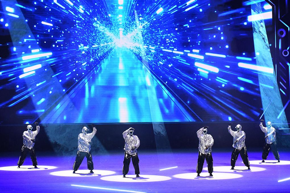 在开场节目《万马奔腾》中,20台机械臂与26台双臂机器人齐挥鼓槌,激昂鼓声奏出奋进节拍。