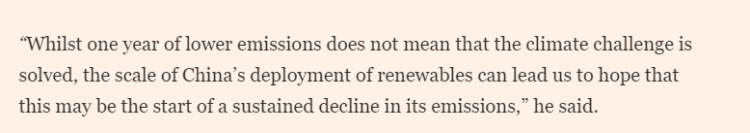 同时,文章称南安普顿大学的一位气候科学家表示,这些数据令人鼓舞,因为它们表明中国对绿色能源的大规模投资开始转化为可衡量的成果。“虽然一年的减排并不意味着气候挑战已经解决,但中国在可再生能源方面的大规模发展让我们有理由期待,这或许将是其排放量持续下降的开端。”