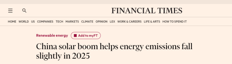 英国《金融时报》日前发文称,2025年,太阳能的蓬勃发展促使中国的碳排放量有所下降。