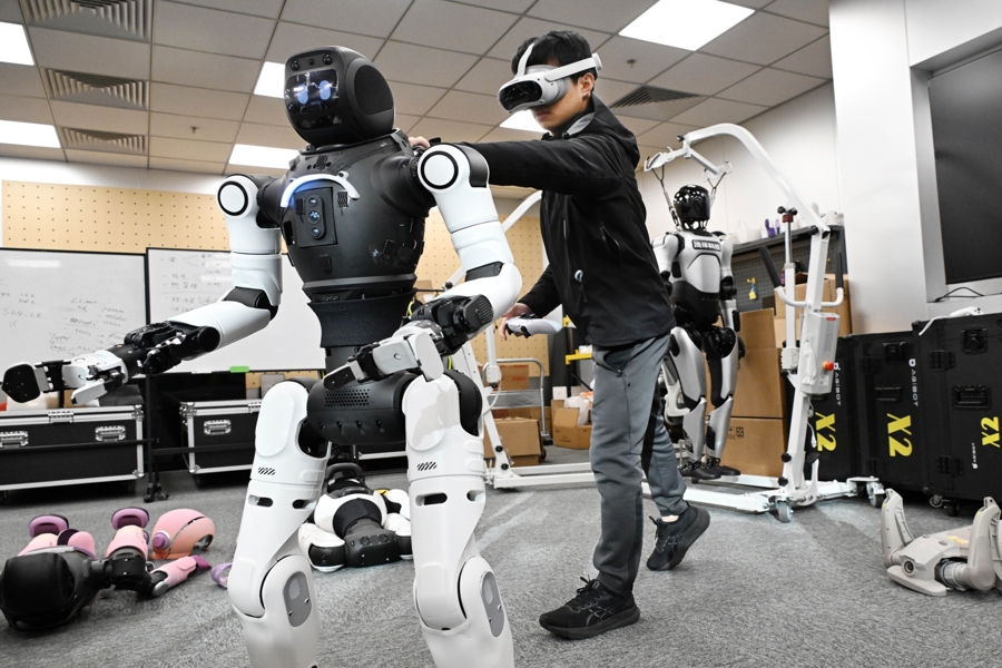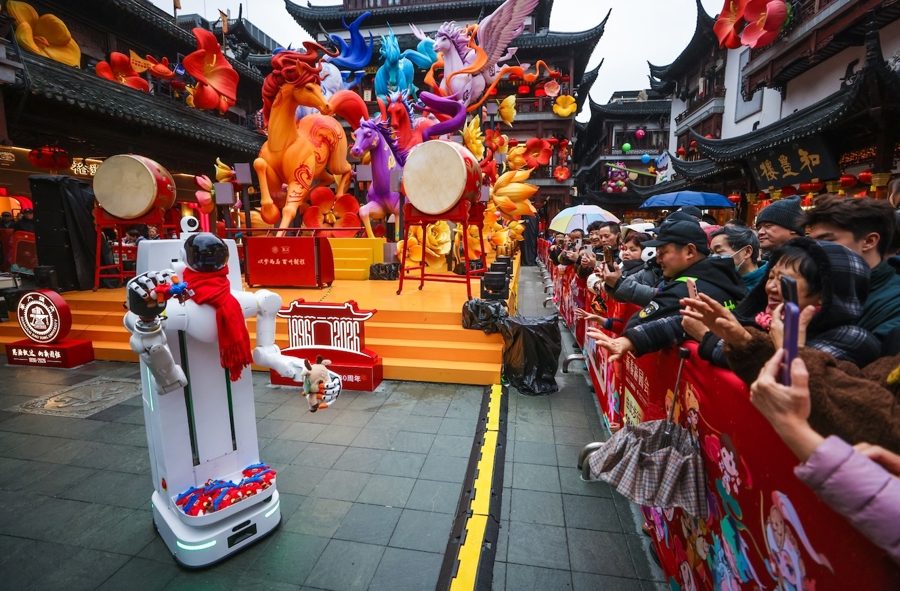 图为由上海交通大学、上海人工智能研究院孵化的具身智能创业企业,在豫园灯会中心广场精心打造了一个未来感十足的智能互动区。文汇报记者袁婧摄
