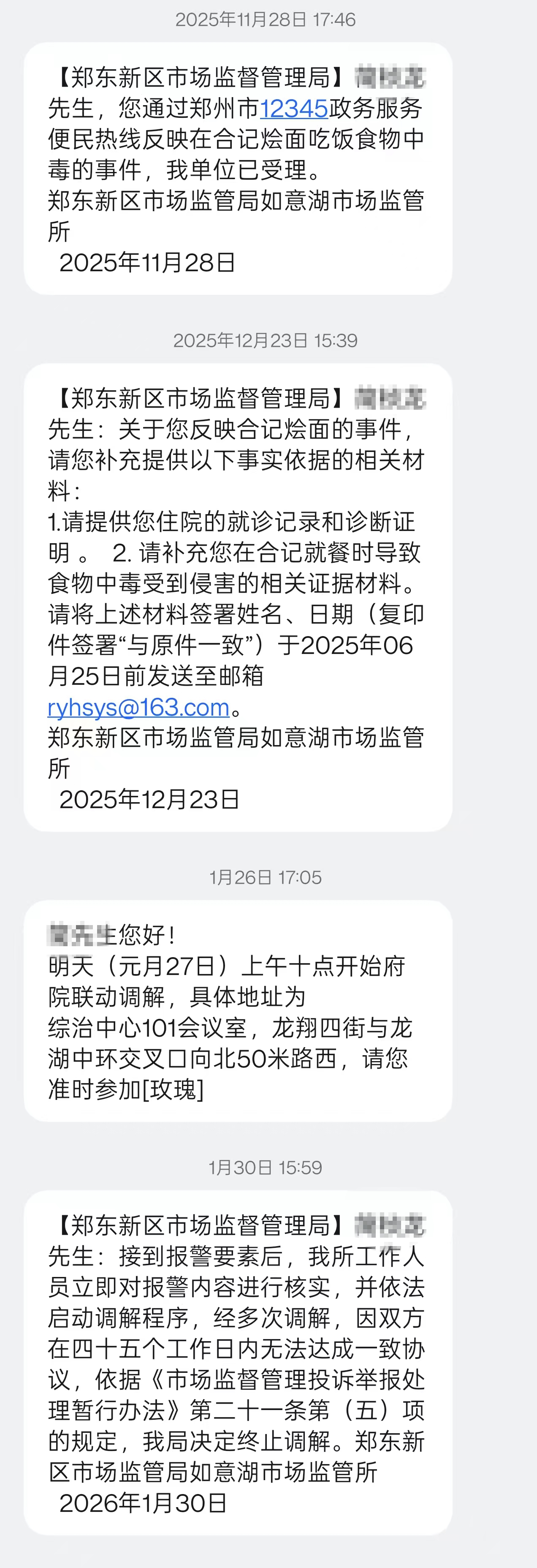 此后,郑东新区市场监督管理局向简先生表示:经多次调解,因双方在四十五个工作日内无法达成一致协议,依据《市场监督管理投诉举报处理暂行办法》第二十一条第(五)项的规定,我局决定终止调解。