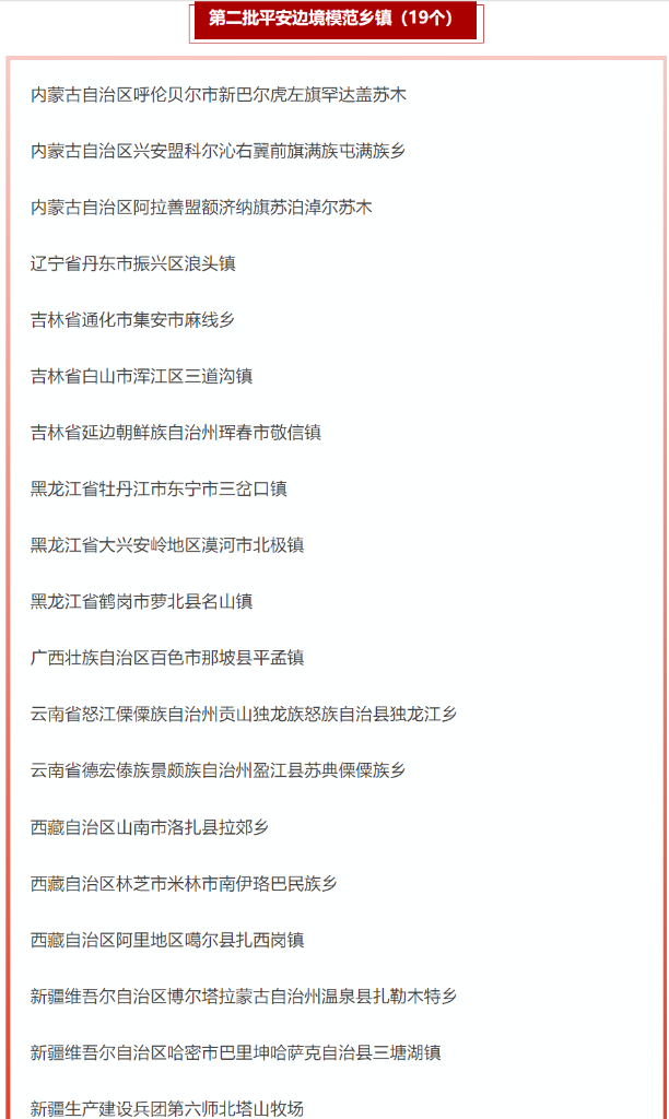 19个第二批平安边境模范乡镇名单。(国家移民管理局微信公众号截图)