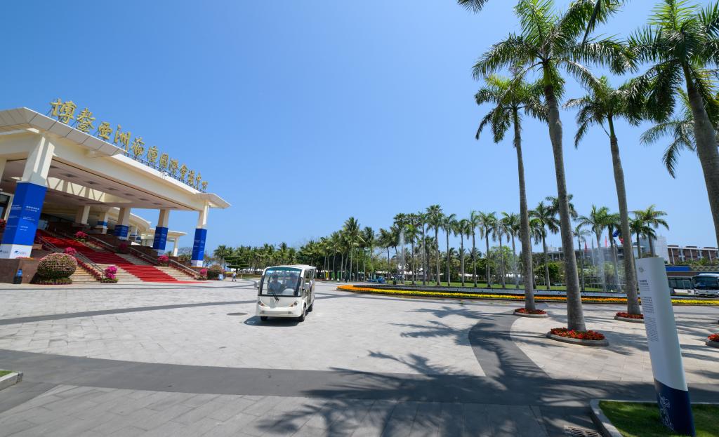 3月24日拍摄的行驶在博鳌零碳示范区的新能源汽车。