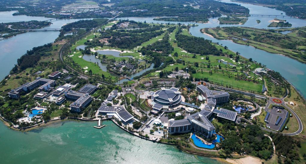 在博鳌零碳示范区拍摄的博鳌亚洲论坛国际会议中心和博鳌亚洲论坛大酒店屋顶的光伏设备(3月19日摄,无人机照片)。