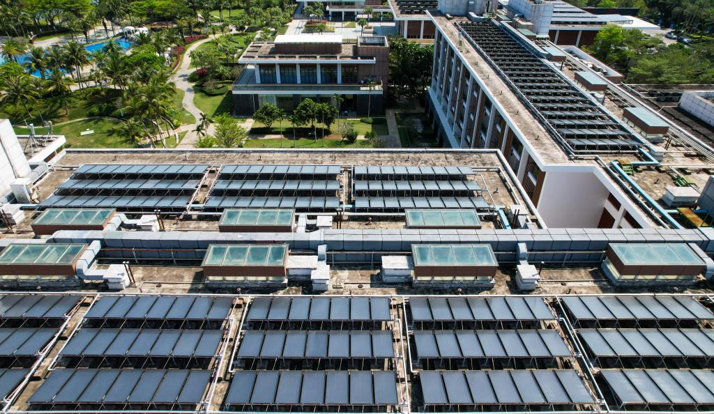 在博鳌零碳示范区拍摄的东屿岛大酒店屋顶的光伏设备(3月19日摄,无人机照片)。