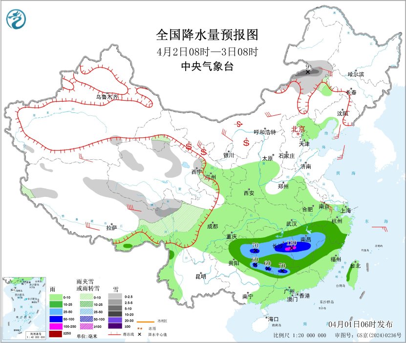 4月2日08时至3日08时,内蒙古东部、西藏东部、青海南部、甘肃河西、川西高原北部等地部分地区有小到中雪或雨夹雪,其中,内蒙古东部等地部分地区有大雪(5~9毫米)。江南大部、华南北部、贵州中东部等地部分地区有中到大雨,其中,贵州东部、湖南中部、江西中部、广东北部、广西东北部等地部分地区有暴雨或大暴雨(100~130毫米)。内蒙古大部、辽东半岛、山东半岛、江苏南部、西藏、甘肃河西等地部分地区有4~6级风,西藏东部部分地区有6~7级风;渤海、东海南部海域、台湾海峡、巴士海峡、北部湾将有5~6级风、阵风7级。