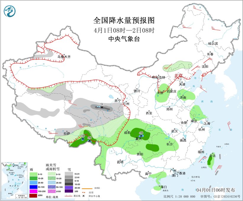 4月1日08时至2日08时,西藏东部和南部、青海南部和西部、川西高原北部、新疆南疆盆地、内蒙古东部、河北北部等地部分地区有小到中雪或雨夹雪,其中,青海南部等地局部地区有大雪(5~9毫米)。西藏东南部、西南地区东部、江南西部、山西中部、山东中北部、江苏大部、广西北部和东南部沿海、广东西南部、海南岛北部、台湾岛等地部分地区有小到中雨,其中,西藏东南部、重庆西南部等地局部地区有大雨(25~40毫米)。内蒙古中东部、黑龙江中北部、辽东半岛、山东半岛、西藏东部和南部、青海西部等地部分地区有4~6级风;渤海、东海大部海域、台湾海峡、台湾以东洋面、巴士海峡将有5~6级风、阵风7级。