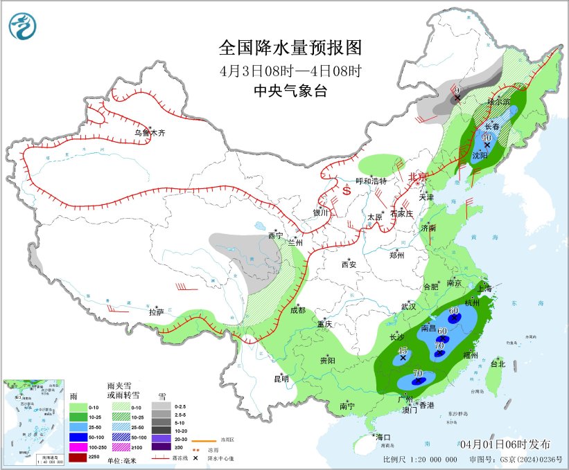 4月3日08时至4日08时,内蒙古东北部、黑龙江中西部、吉林中西部、青海东部和南部、川西高原北部等地部分地区有小到中雪或雨夹雪,其中,内蒙古东北部、黑龙江西南部等地部分地区有大雪(5~9毫米)。辽宁大部、江南大部、华南北部和东部等地部分地区有中到大雨,其中,江西东部、浙江西南部、福建西部、广东北部等地部分地区有暴雨(50~70毫米)。内蒙古大部、辽宁大部、山西大部、河北大部、山东半岛、陕西北部、西藏南部等地部分地区有4~6级风,西藏东部部分地区有6~7级风;渤海、渤海海峡、黄海大部海域、东海大部海域、台湾海峡、台湾以东洋面、北部湾将有6~7级风、阵风8~9级。