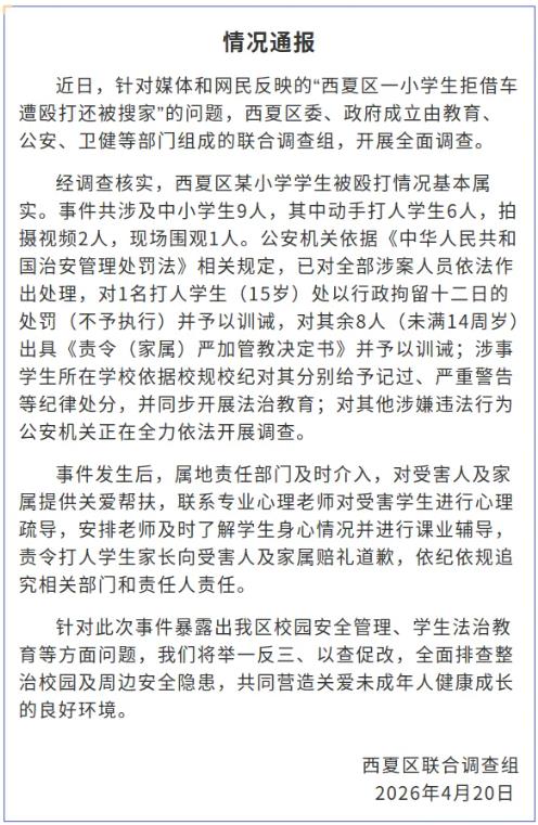 中新网4月20日电 据“西夏阳光政务”微信公众号消息,宁夏银川西夏区联合调查组4月20日发布情况通报称,近日,针对媒体和网民反映的“西夏区一小学生拒借车遭殴打还被搜家”的问题,西夏区委、政府成立由教育、公安、卫健等部门组成的联合调查组,开展全面调查。
