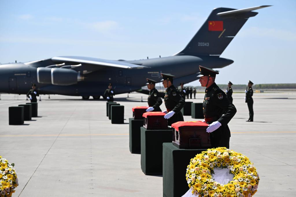 4月22日,第十三批在韩中国人民志愿军烈士遗骸由中国空军运-20B从韩国接回辽宁沈阳。这是迎回仪式上,礼兵将覆盖着五星红旗的志愿军烈士遗骸棺椁整齐安放。新华社发(余红春 摄)