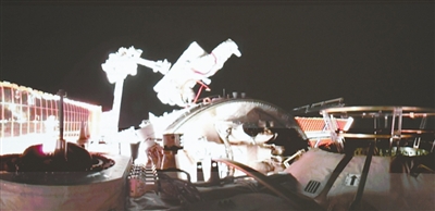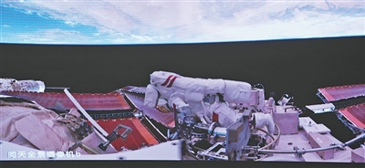在北京航天飞行控制中心屏幕上拍摄的陈中瑞在空间站组合体舱外工作画面。新华社记者 厉彦辰摄