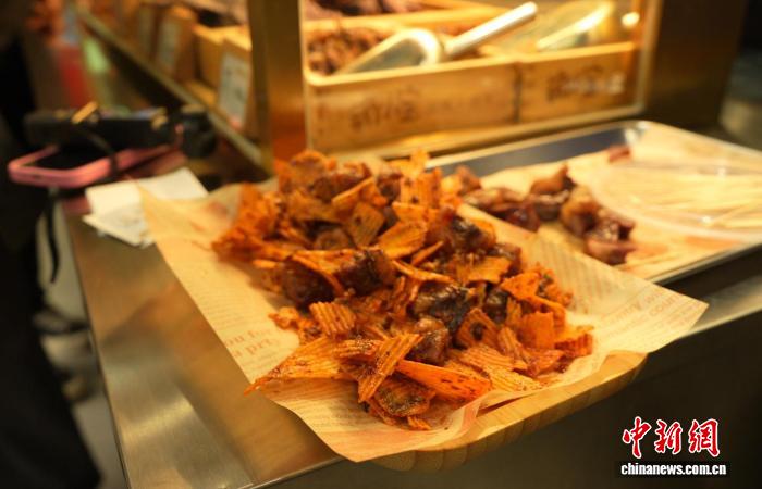 “萌小宝现烤牛肉干”店内的牛肉干拌薯片。 中新网记者 刘文华 摄