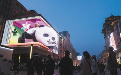北京市王府井步行街百货大楼墙体,裸眼3D大屏画面吸引人们观看。