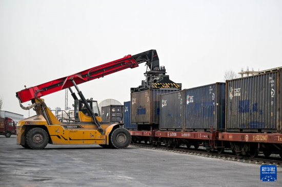 4月3日,在呼和浩特市新畅铁路专用线,铁海联运“一单制”运输专列开行。