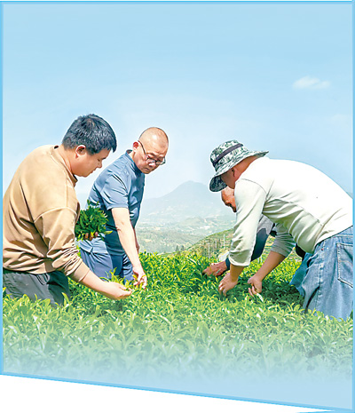 江岔村驻村第一书记陈毓(左二)在高山茶园查看茶叶品质。