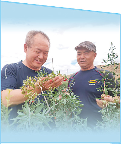 枸杞采摘期,吊堡子村驻村第一书记李宗仁(左)来到枸杞地里查看枸杞产量情况。