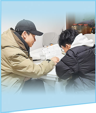 文店村驻村第一书记郭菲(左)在村民家中给孩子辅导功课。