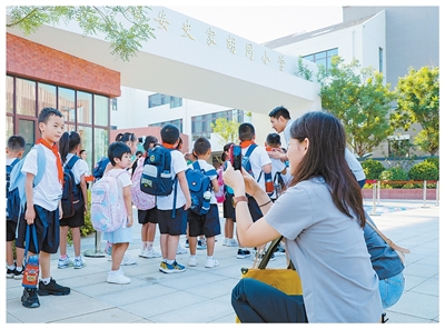 雄安史家胡同小学校门口,家长在送孩子上学。
