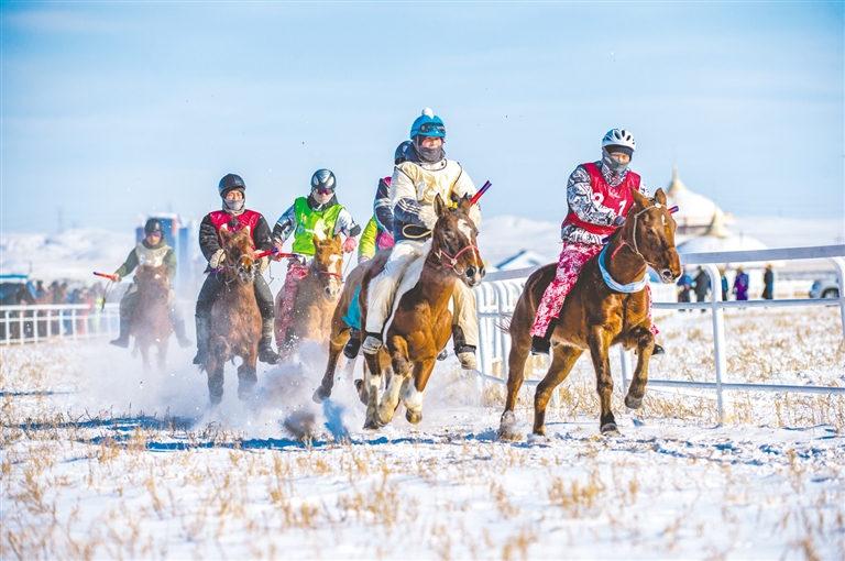 1月18日,锡林浩特市那达慕风情园内马蹄踏雪、人声鼎沸,“歌游内蒙古·畅享锡林浩特”——冬季那达慕暨蒙古马超级联赛在欢腾的歌声中拉开序幕。开幕式上,随着马蹄的哒哒声,一支雄壮的马队踏雪而来,骑手们身着艳丽的蒙古袍,驾驭着矫健的蒙古马,以整齐的队列自远处缓缓走来。歌声悠扬,舞姿豪迈,演员们以动人的演绎,完美诠释了力量与艺术之美。本次赛事包含15公里耐力赛、10公里3人团体接力赛、跑马射箭、跑马拾哈达、6公里走马及搏克比赛等比赛项目。赛场上,骑手们驭马飞驰,人与马默契配合,在银装素裹的雪原上纵横驰骋。在跑马射箭与跑马拾哈达项目上,骑手在飞奔的马匹上挽弓搭箭、俯身拾物,动作行云流水,精湛技艺引来观众阵阵惊呼与赞叹。除了扣人心弦的比赛,本次活动还为游客打造了丰富的冰雪互动体验。冰雪涮肉宴香气四溢,草原篝火电音派对将热情推向高潮,千人雪战、雪地拔河等趣味项目让游客亲身参与,尽情享受冰雪乐趣。现场还同步举办了锡林浩特“伊德喜”草原冬储肉展销活动,让游客在观赛之余,还能选购到正宗锡林郭勒牛羊肉,体验纯正的草原风味。(记者