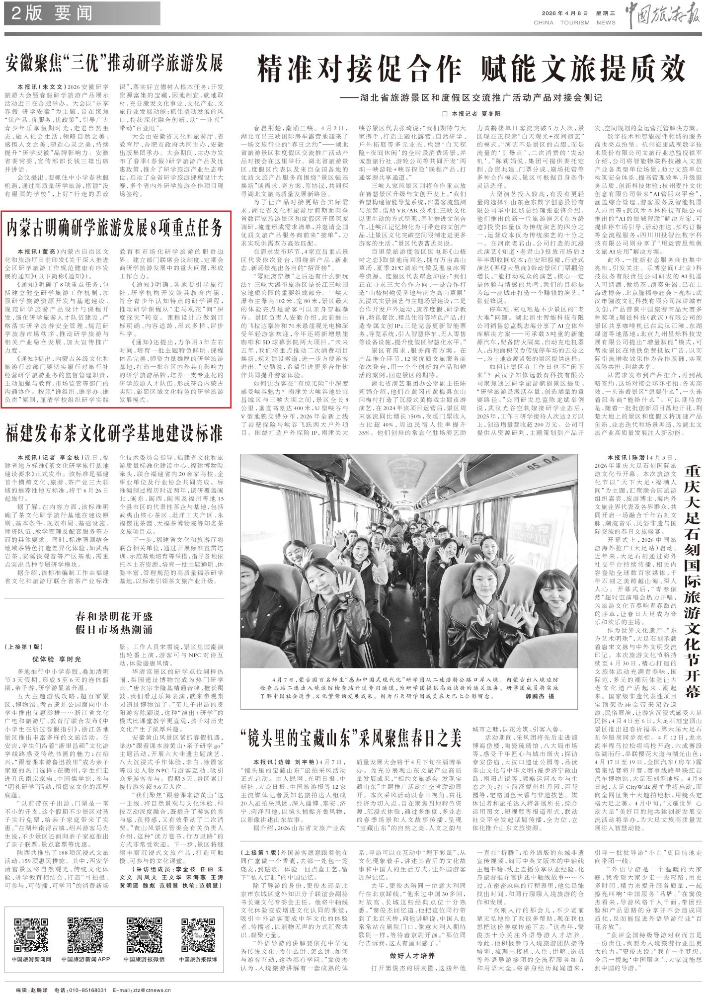 2026年4月8日《中国旅游报》2版刊发题为《内蒙古明确研学旅游发展8项重点任务》的文章,报道了内蒙古自治区文化和旅游厅日前印发《关于深入推进全区研学旅游工作规范健康有序发展的通知》明确了8项重点任务,包括建立健全研学旅游工作机制、加强研学旅游资源开发与基地建设等。
