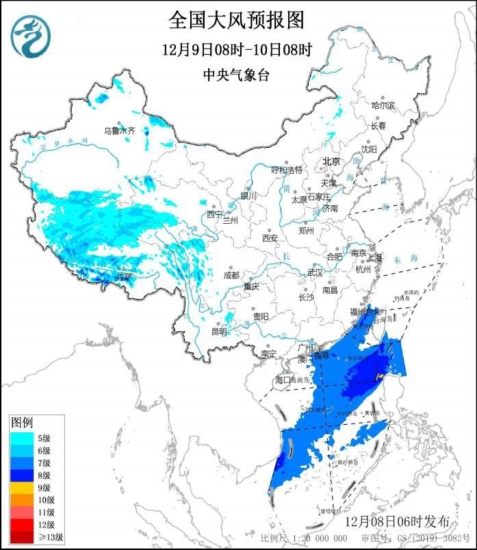 预计,12月8日08时至9日08时,西藏中西部、青海西南部、川西高原、新疆北部等地部分地区将有5~6级风,西藏中西部和青海西南部局地风力可达7~8级;东海大部、台湾海峡、台湾以东洋面、巴士海峡、南海北部、中部和西南部海域、北部湾将有7~8级、阵风9级的大风,其中台湾海峡部分海域的风力可达9级、阵风10级。