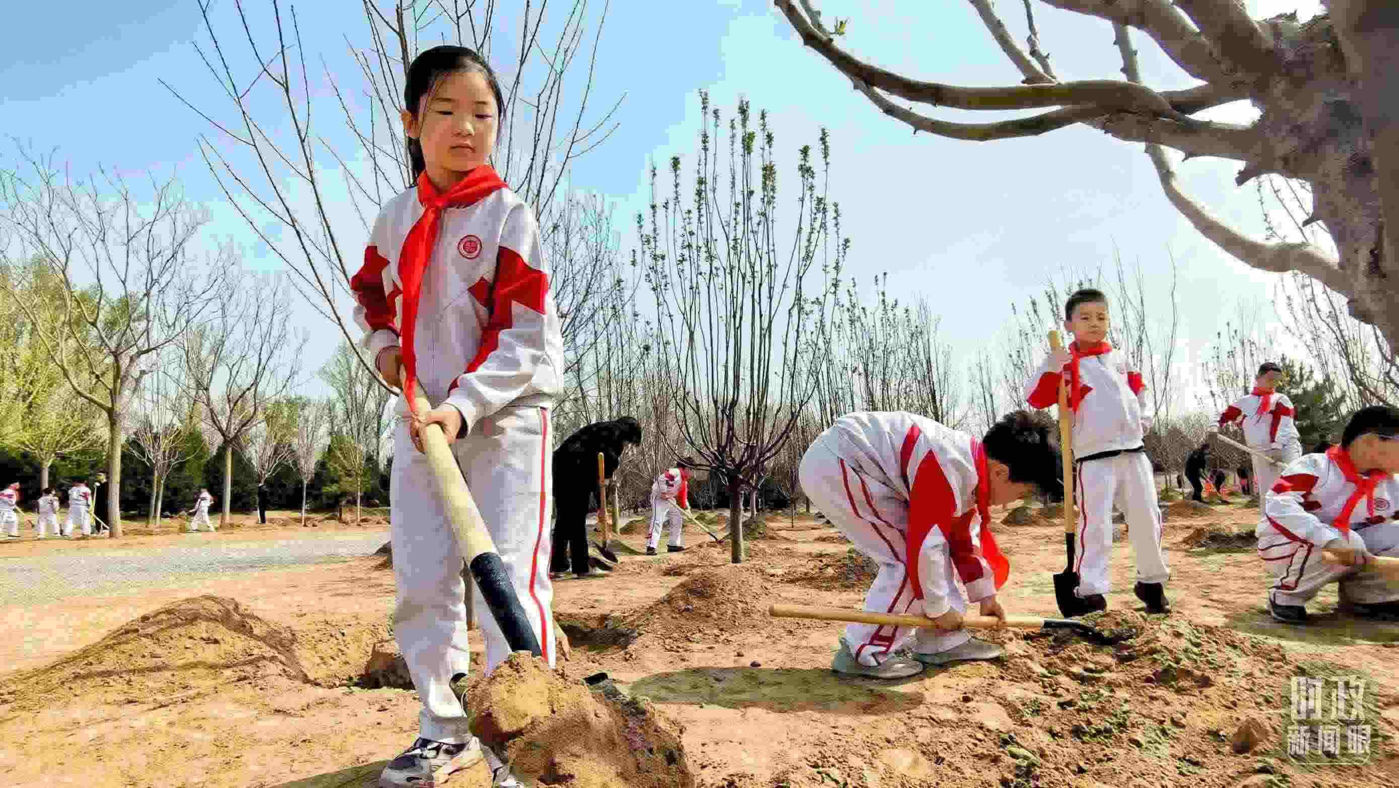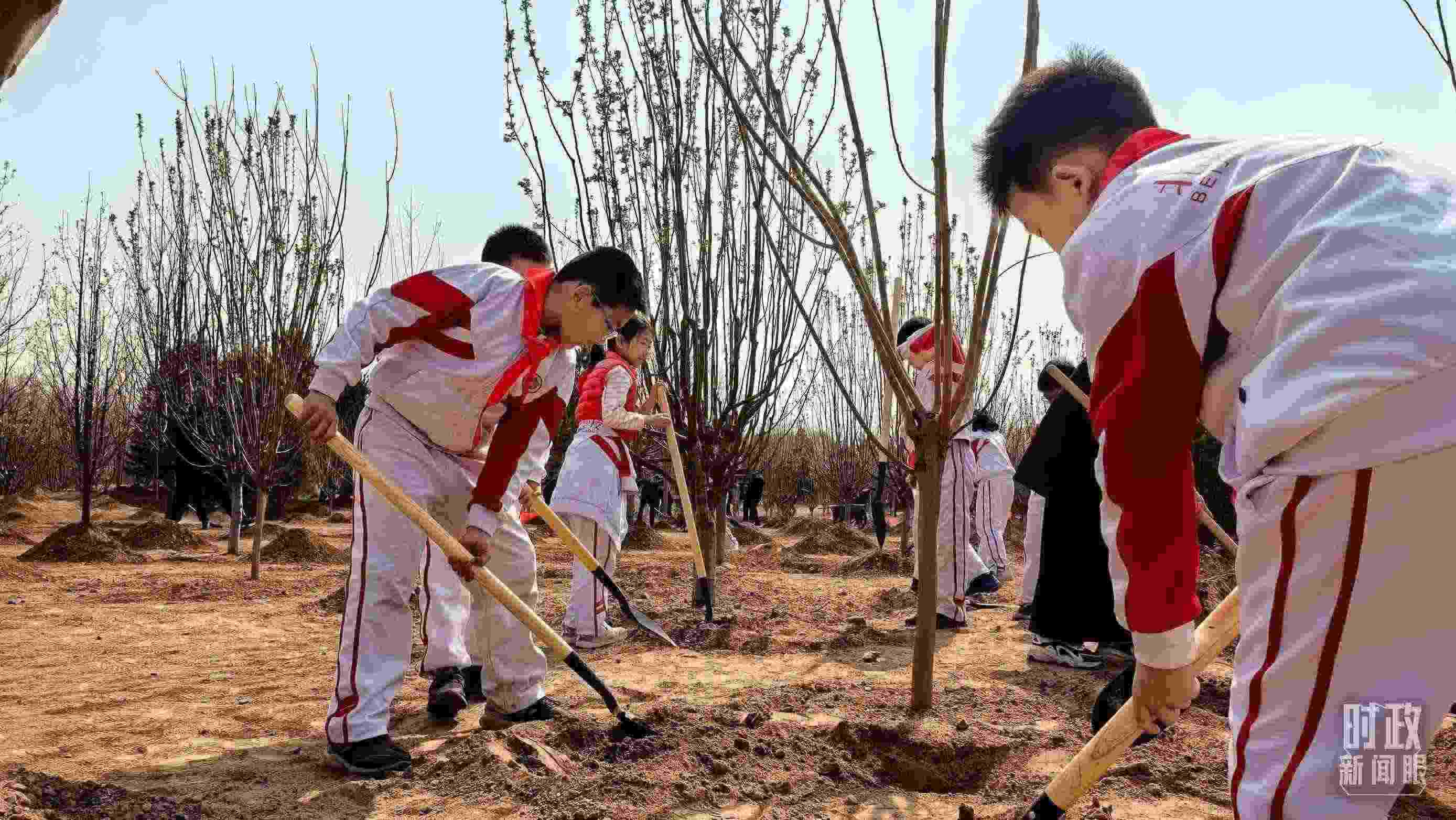 △现场参加植树的少先队员们。(总台央视记者鄂介甫拍摄)
