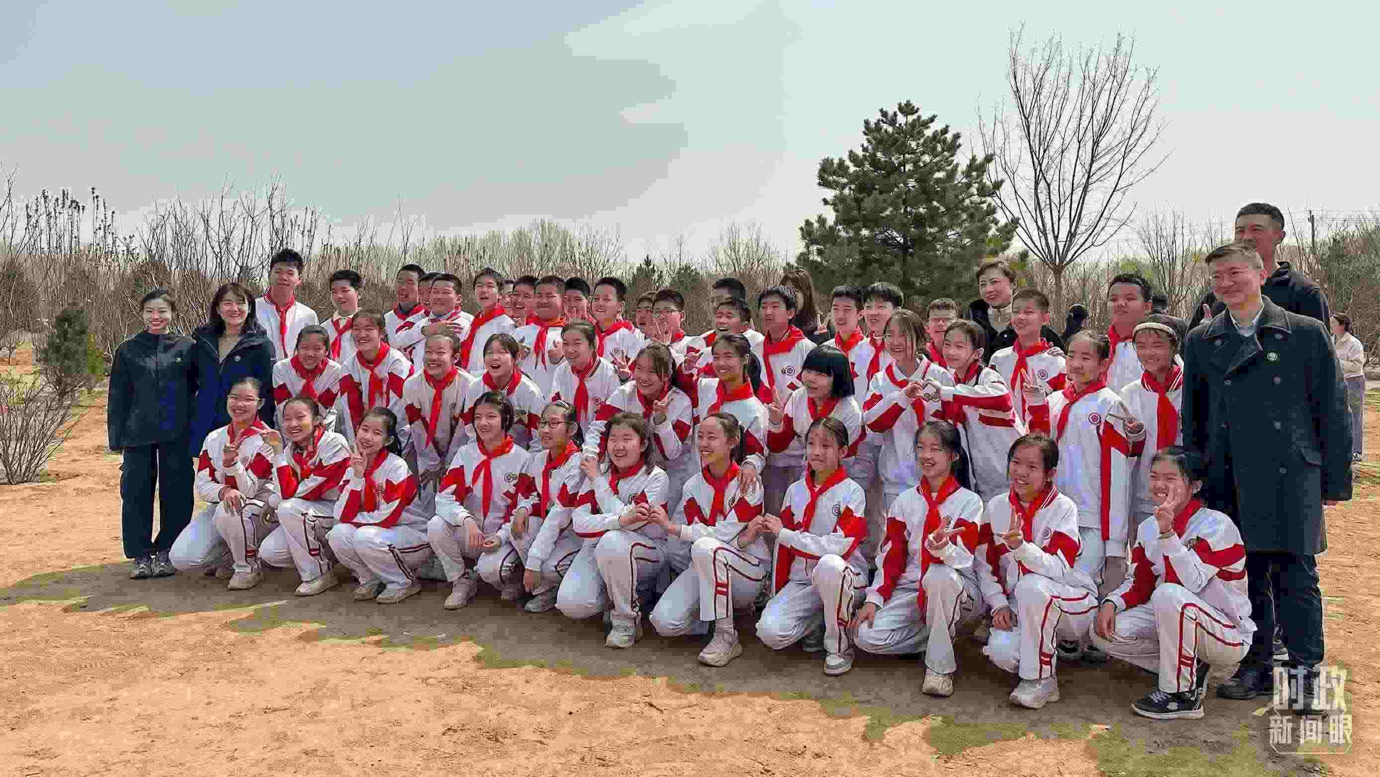△参加植树的少先队员们合影留念。(总台央视记者卢心雨拍摄)