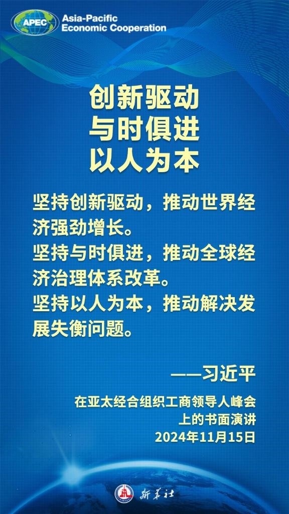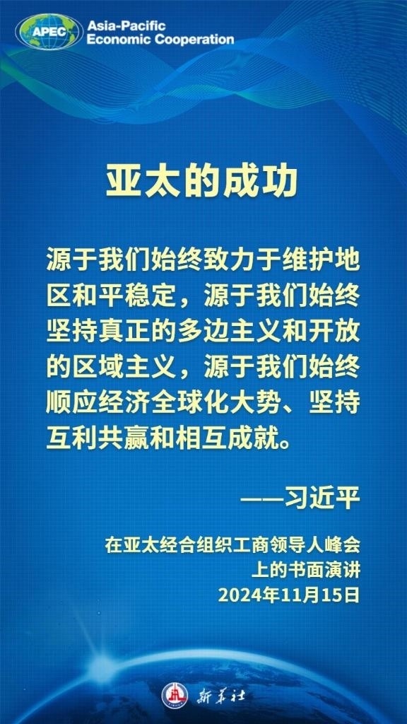 当地时间11月15日上午,国家主席习近平向在利马举行的亚太经合组织工商领导人峰会发表题为《把握时代大势 共促世界繁荣》的书面演讲,这样阐述亚太合作——