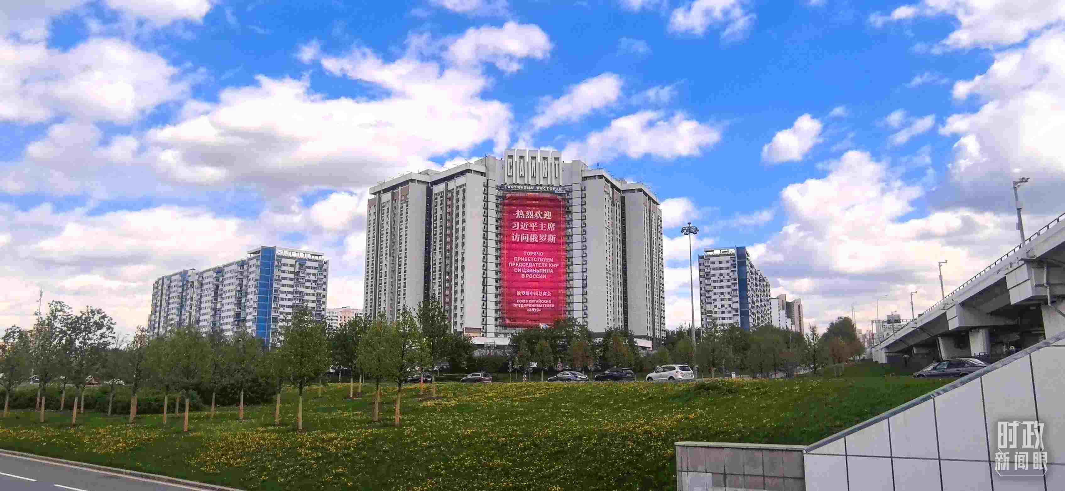 △莫斯科街头醒目的欢迎标语。(总台央视记者范凯拍摄)